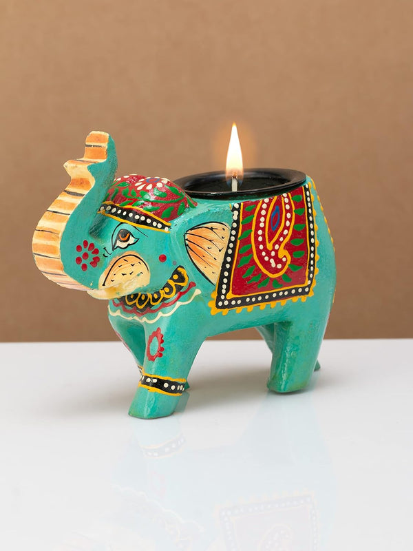 Handcrafted and Colorful Wooden Elephant Tea Light Holder - Blue