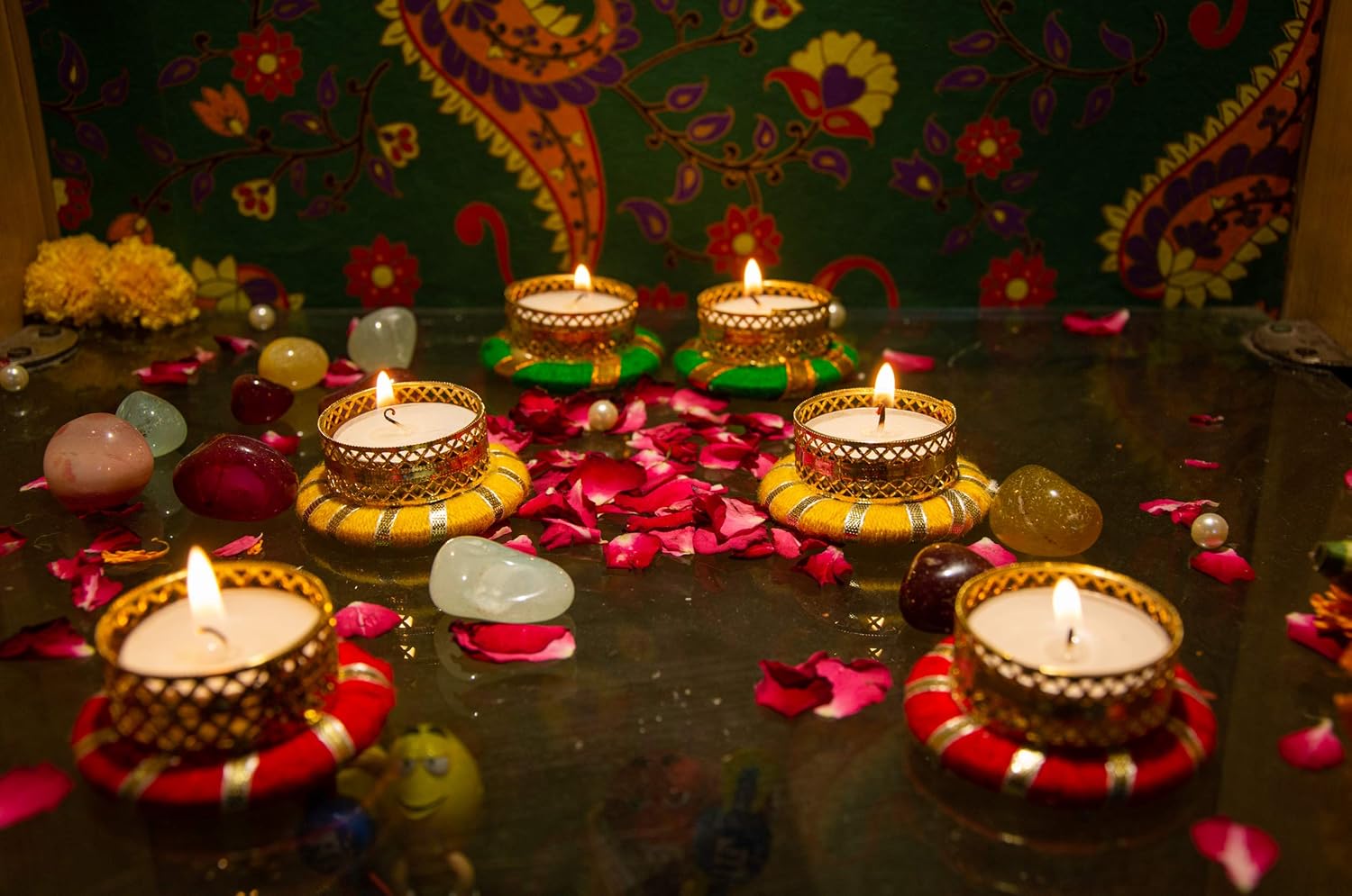 Crafted with meticulous attention to detail, these diyas blend traditional charm with modern aesthetics. The intricate metalwork and vibrant hues create a stunning visual impact, perfect for Diwali celebrations or everyday decor. Each diya is designed to hold a tealight candle, casting a warm and inviting glow that enhances the beauty of the design.