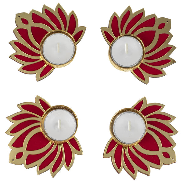 Set of 4 Metal Brass Diyas Decorated with Lotus for Diwali - Tealight Candle Holder