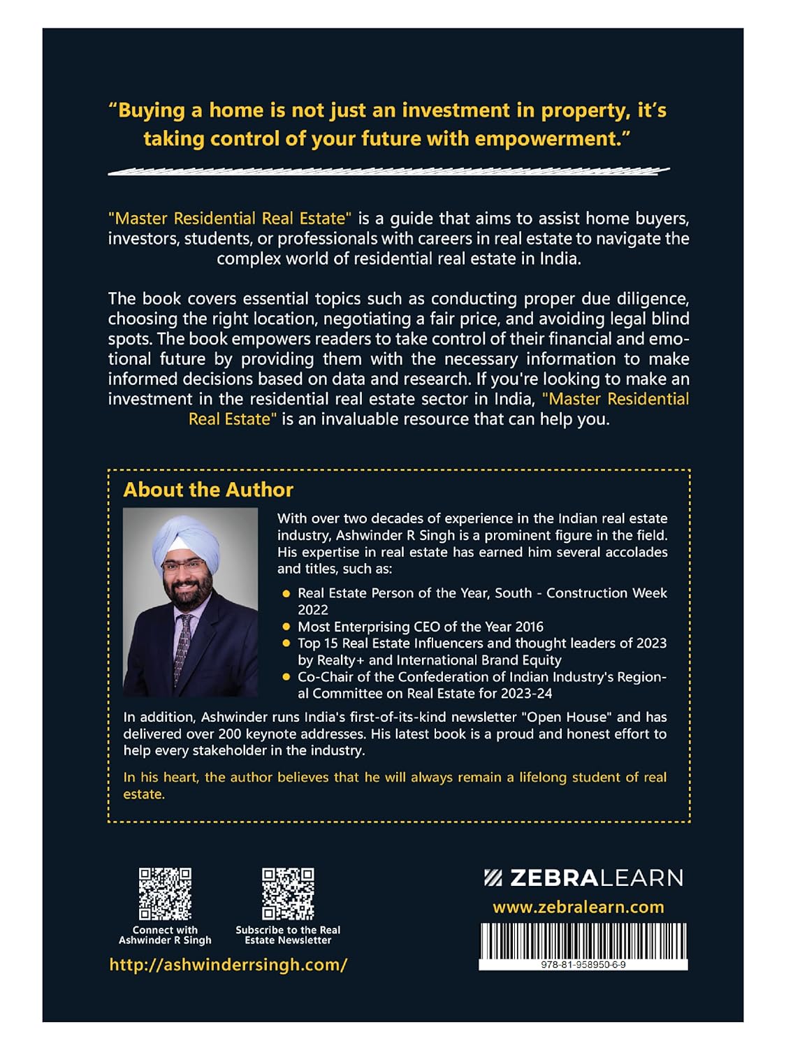 A guide aimed to assist home buyers, investors, students, or professionals with careers in real estate to navigate the complex world of residential real estate in India. Covers essential topics such as conducting proper due diligence, choosing the right location, negotiating a fair price, and avoiding legal blind spots. The book empowers readers to take control of their financial and emotional future by providing "Master Residential Real Estate" is a guide that aims to assist home buyers, investors, students, or professionals with careers in real estate to navigate the complex world of residential real estate in India. The book covers essential topics such as conducting proper due diligence, choosing the right location, negotiating a fair price, and avoiding legal blind spots. The book empowers readers to take control of their financial and emotional future by providing them with the necessary information to make informed decisions based on data and research. If you're looking to make an investment or career in the residential real estate sector in India, "Master Residential Real Estate" is an invaluable resource that can help you. About the Author With over two decades of experience in the Indian real estate industry, Ashwinder R Singh is a prominent figure in the field. His expertise in real estate has earned him several accolades and titles, such as: Real Estate Person of the Year, South - Construction Week 2022 Most Enterprising CEO of the Year 2016 Top 15 Real Estate Influencers by Realty + and Thought Leader of the Year by International Brand Equity in 2023. Co-Chair of the Confederation of Indian Industry's Regional Committee on Real Estate for 2023-24 In addition, Ashwinder runs India's first-of-its-kind newsletter "Open House" and has delivered over 200 keynote addresses. His latest book is a proud and honest effort to help every stakeholder in the industry. In his heart, the author believes that he will always remain a lifelong student of real estate.