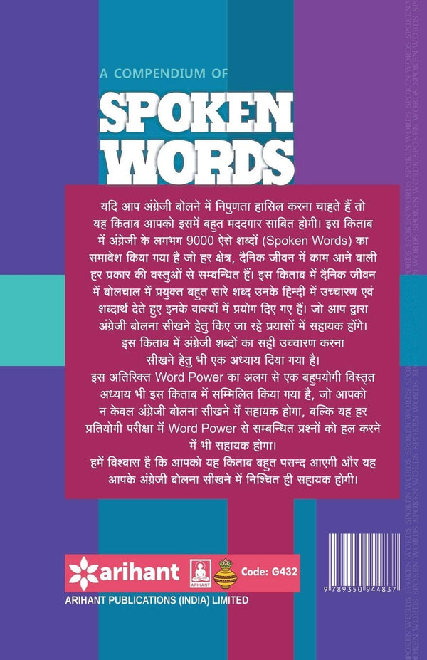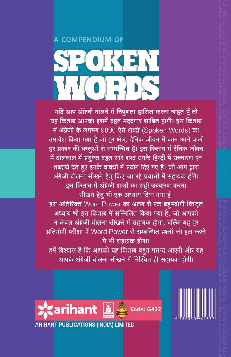 1. The book is large collection of spoken words with their hindi meaning and pronunciation 2. It contains around 9000 words from English language 3. Every grammatical concept has been explained in 15 chapters 4. Special section on How to pronounce a word correctly “A Compendium of Spoken Words” has been designed to acquaint the readers with English words used for conversation in our day-today lives. The present book contains around 9000 words from the English Language. Large collection of spoken words along with their Hindi meanings and the way of pronouncing that words in Hindi has been given in this book. The book begins with a special section on How to Pronounce a Word Correctly. The book has been divided into 15 chapters namely Words in Frequent Use Alphabet,Synonyms, Antonyms, Contranyms, Homonyms, Heteronyms, Homographs, Plaindromes, Pangram,Idioms & Phrases, Words Used as Different Parts of Speech, One Word Substitutions, Words Used in the Constitution, The Speaking Tree: Words by Category, Foreign Words, Phobias, Manias, Group of Collective Noun, Words: Used in British & American English, Traits of People, Cries of Animals & Birds,Collocation and Words with their Roots & Their Meaning."