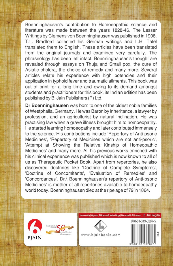 The Lesser Writings of C.M.F. von Boenninghausen offers a rare glimpse into the mind of one of homeopathy's pioneering figures. This collection of essays and articles delves into the profound insights of Dr. Boenninghausen, shedding light on his clinical experience and philosophical approach to medicine.
