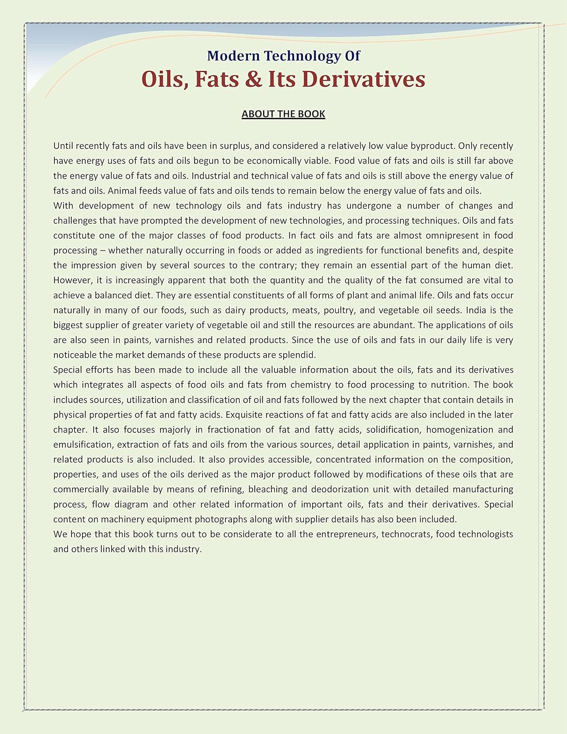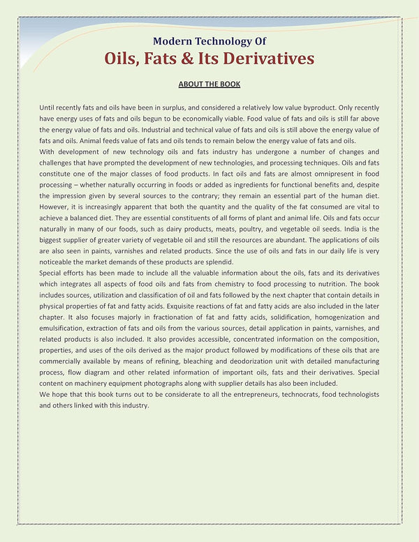Modern Technology of Oils, Fats & Its Derivatives is your comprehensive guide to understanding the complex world of oil and fat production. This book delves deep into the science and technology behind converting natural resources into valuable products.