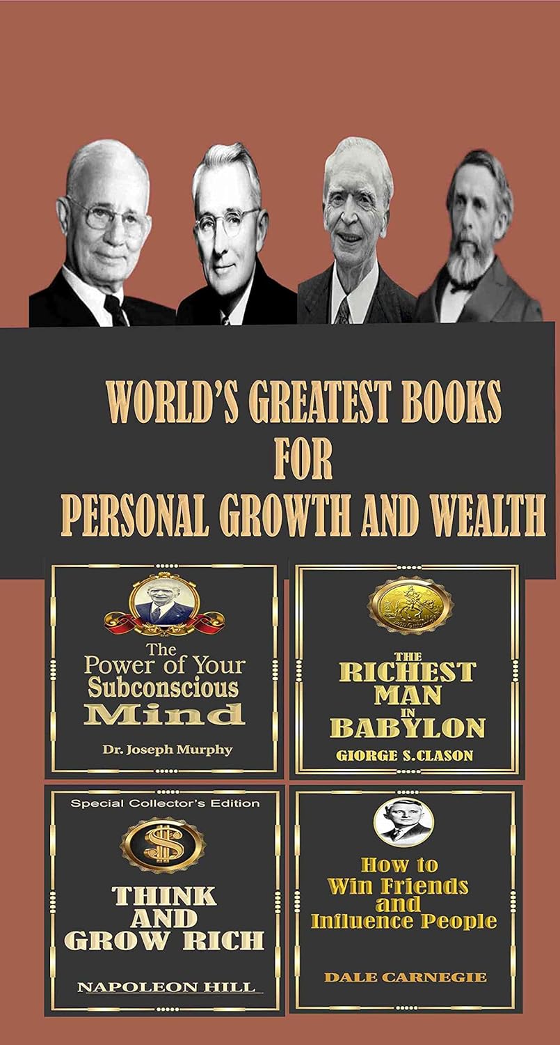 "World's Greatest Books For Personal Growth & Wealth (Box Set)" featuring authors Dale Carnegie, Napoleon Hill, Dr. Joseph Murphy, and George S. Clason, offers a comprehensive collection aimed at personal development and financial prosperity.