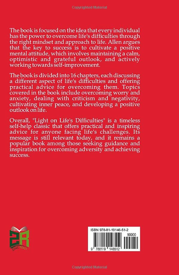 The book is focused on the idea that every individual has the power to overcome life's difficulties through the right mindset and approach to life. Allen argues that the key to success is to cultivate a positive mental attitude, which involves maintaining a calm, optimistic and grateful outlook, and actively working towards self-improvement. The book is divided into 16 chapters, each discussing a different aspect of life's difficulties and offering practical advice for overcoming them. Topics covered in the book include overcoming worry and anxiety, dealing with criticism and negativity, cultivating inner peace, and developing a positive outlook on life. Overall, "Light on Life's Difficulties" is a timeless self-help classic that offers practical and inspiring advice for anyone facing life's challenges. Its message is still relevant today, and it remains a popular book among those seeking guidance and inspiration for overcoming adversity and achieving success.