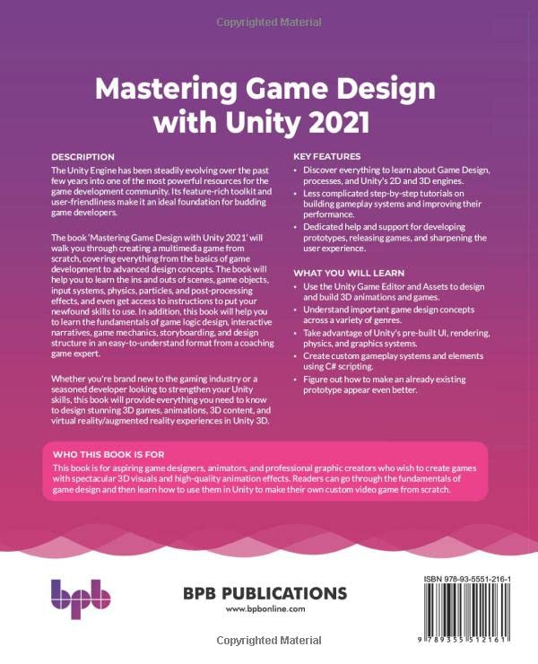 Overall, "Mastering Game Design with Unity 2021" likely serves as a valuable resource for both newcomers and experienced developers looking to enhance their skills and create successful games using Unity.
