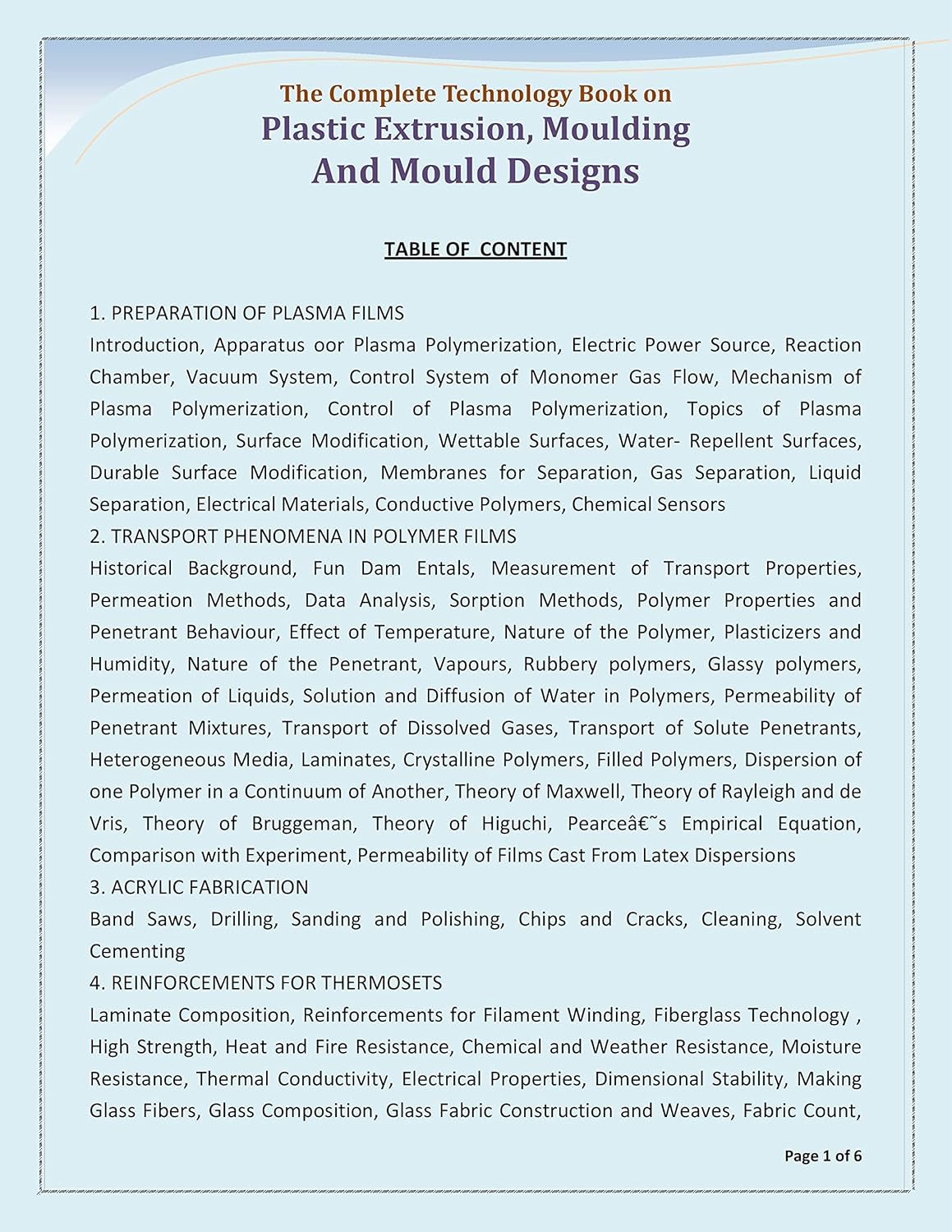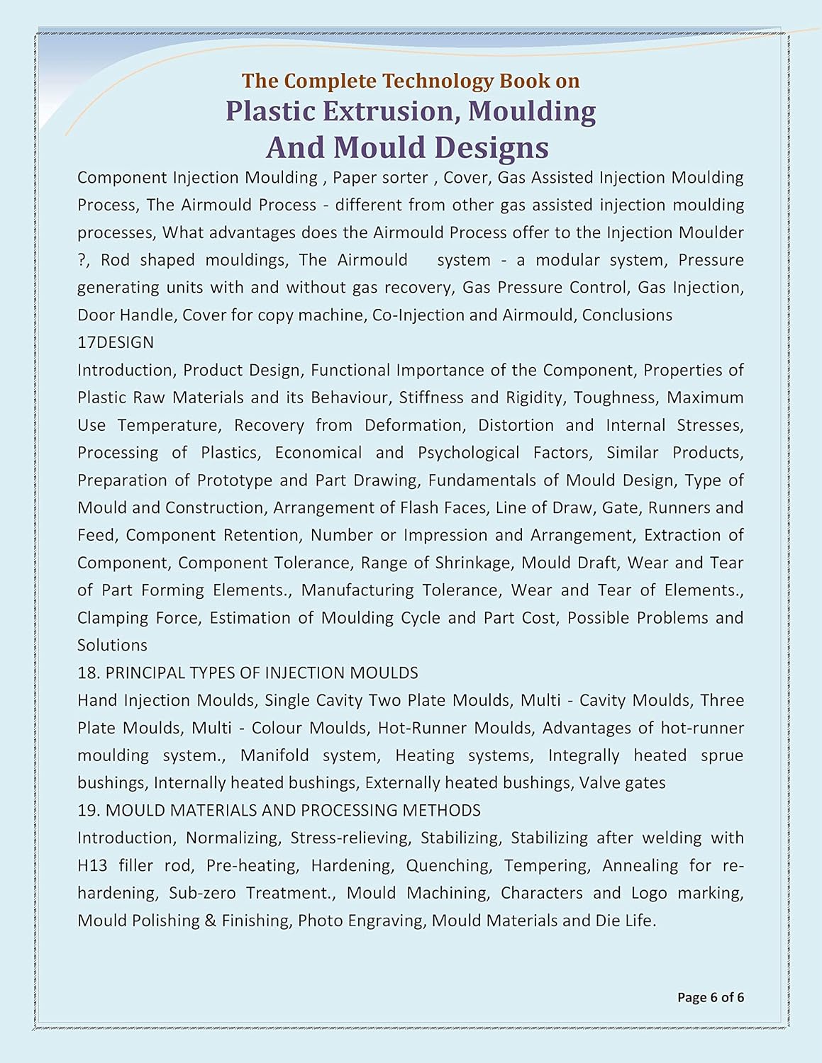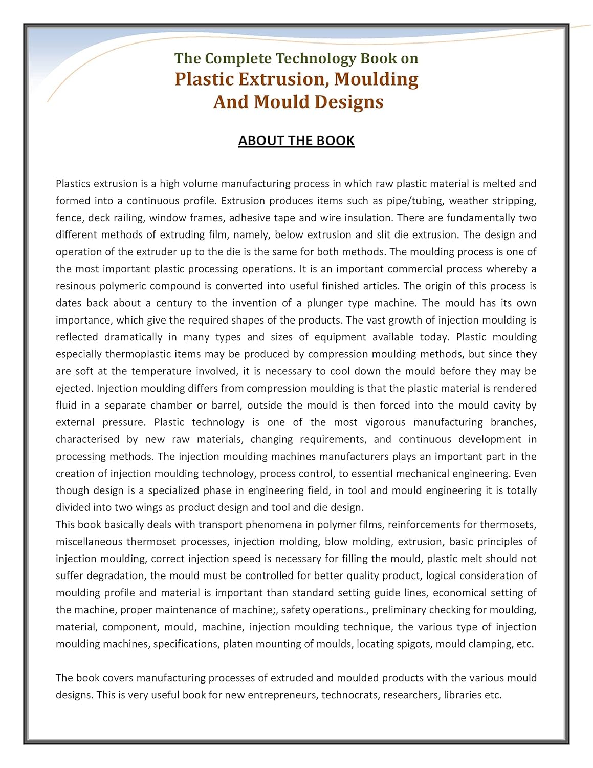"The Complete Technology Book on Plastic Extrusion, Moulding and Mould Designs" is a valuable resource for anyone seeking to understand the intricate world of plastic manufacturing. This book empowers individuals and businesses to innovate and excel in the ever-evolving plastics industry.