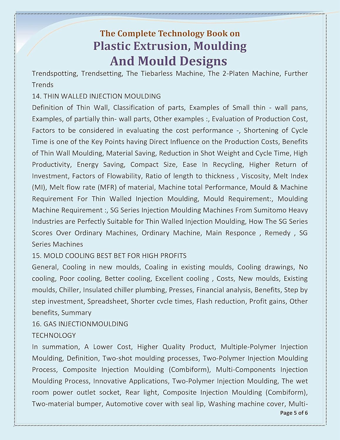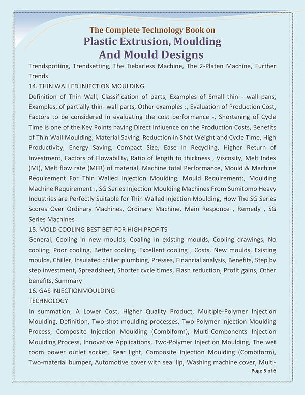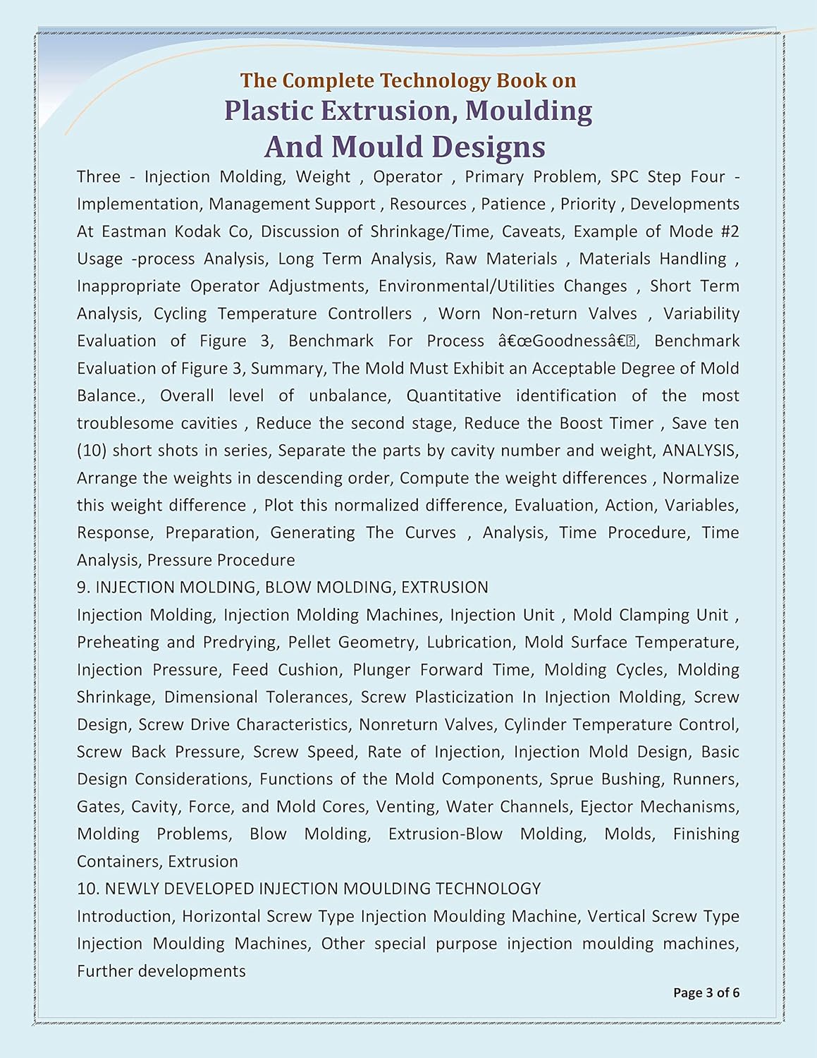 "The Complete Technology Book on Plastic Extrusion, Moulding and Mould Designs" is a valuable resource for anyone seeking to understand the intricate world of plastic manufacturing. This book empowers individuals and businesses to innovate and excel in the ever-evolving plastics industry.