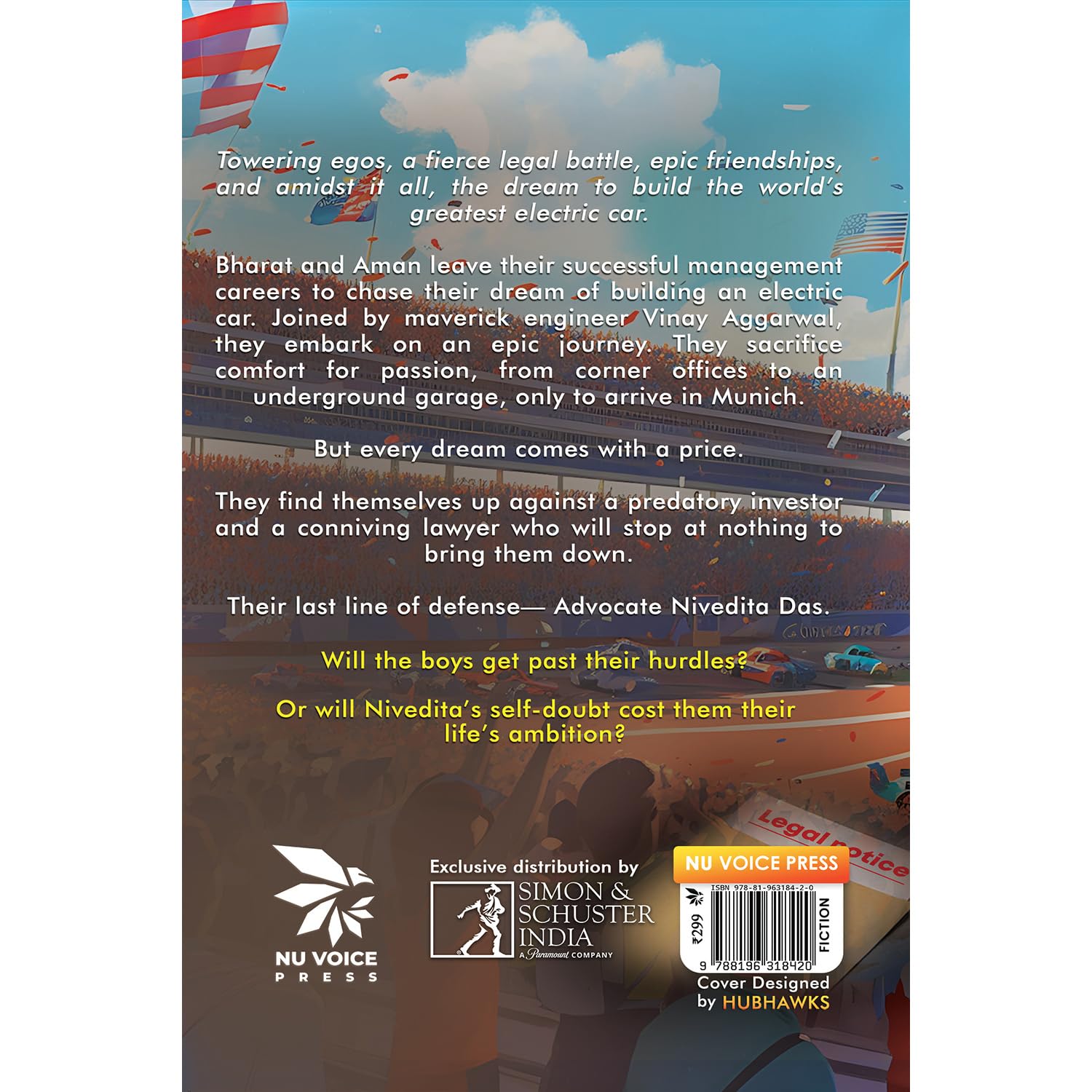"Towering egos, a fierce legal battle, epic friendships, and amidst it all, the dream to build the world’s greatest electric car. Bharat and Aman leave their successful management careers to chase their dream of building an electric car. Joined by maverick engineer Vinay Aggarwal, they embark on an epic journey. They sacrifice comfort for passion, from corner offices to an underground garage, only to arrive in Munich. But every dream comes with a price. They find themselves up against a predatory investor and a conniving lawyer who will stop at nothing to bring them down. Their last line of defense— Advocate Nivedita Das. Will the boys get past their hurdles? Or will Nivedita’s self-doubt cost them their life’s ambition?"