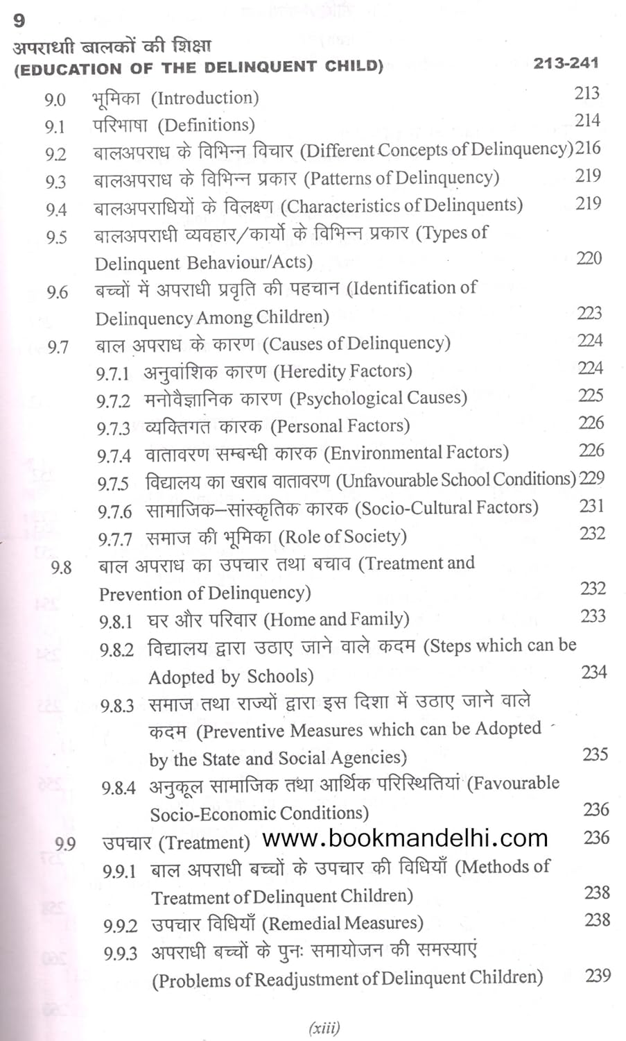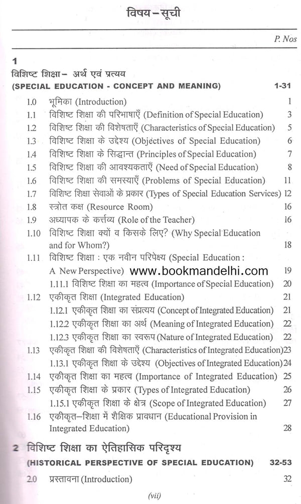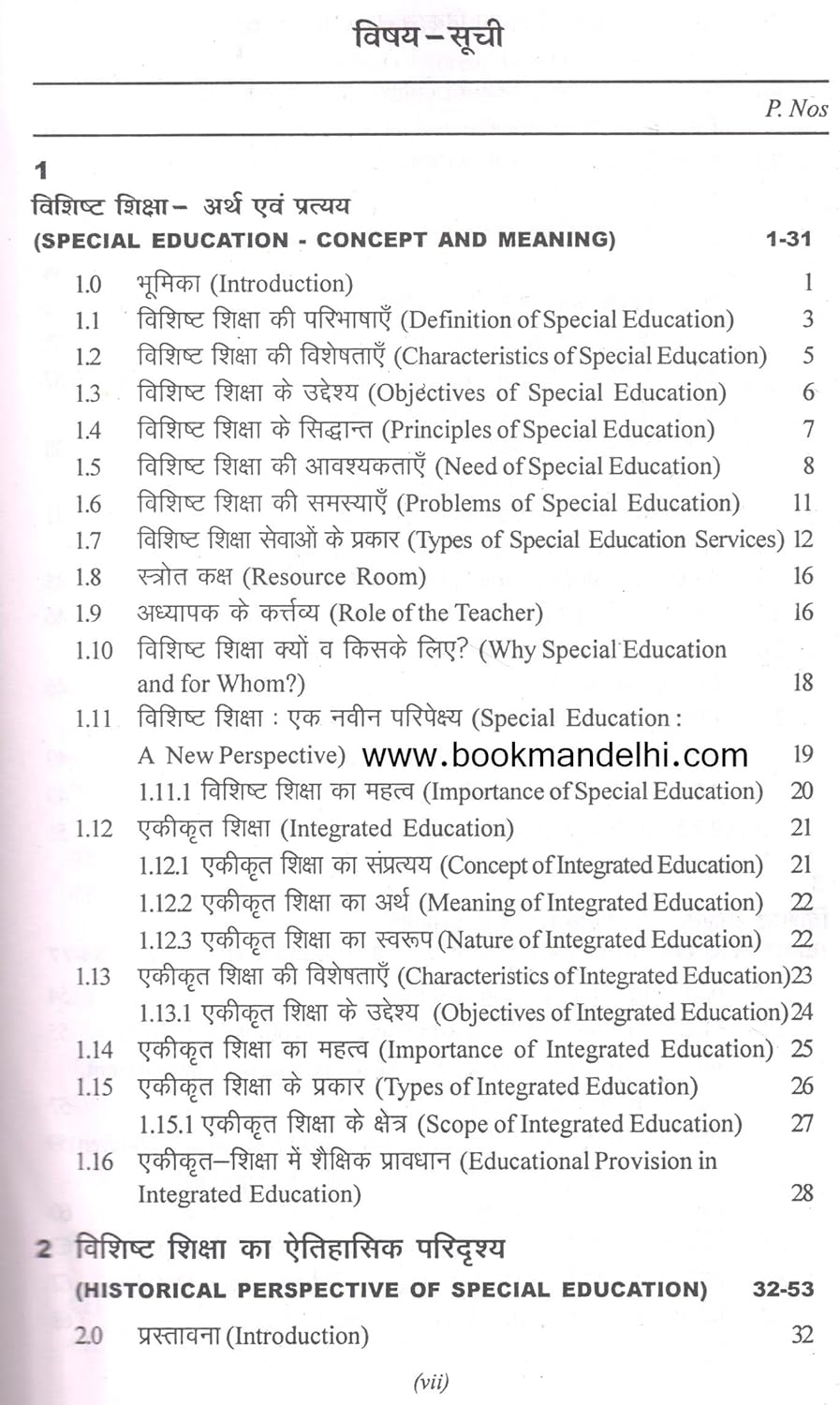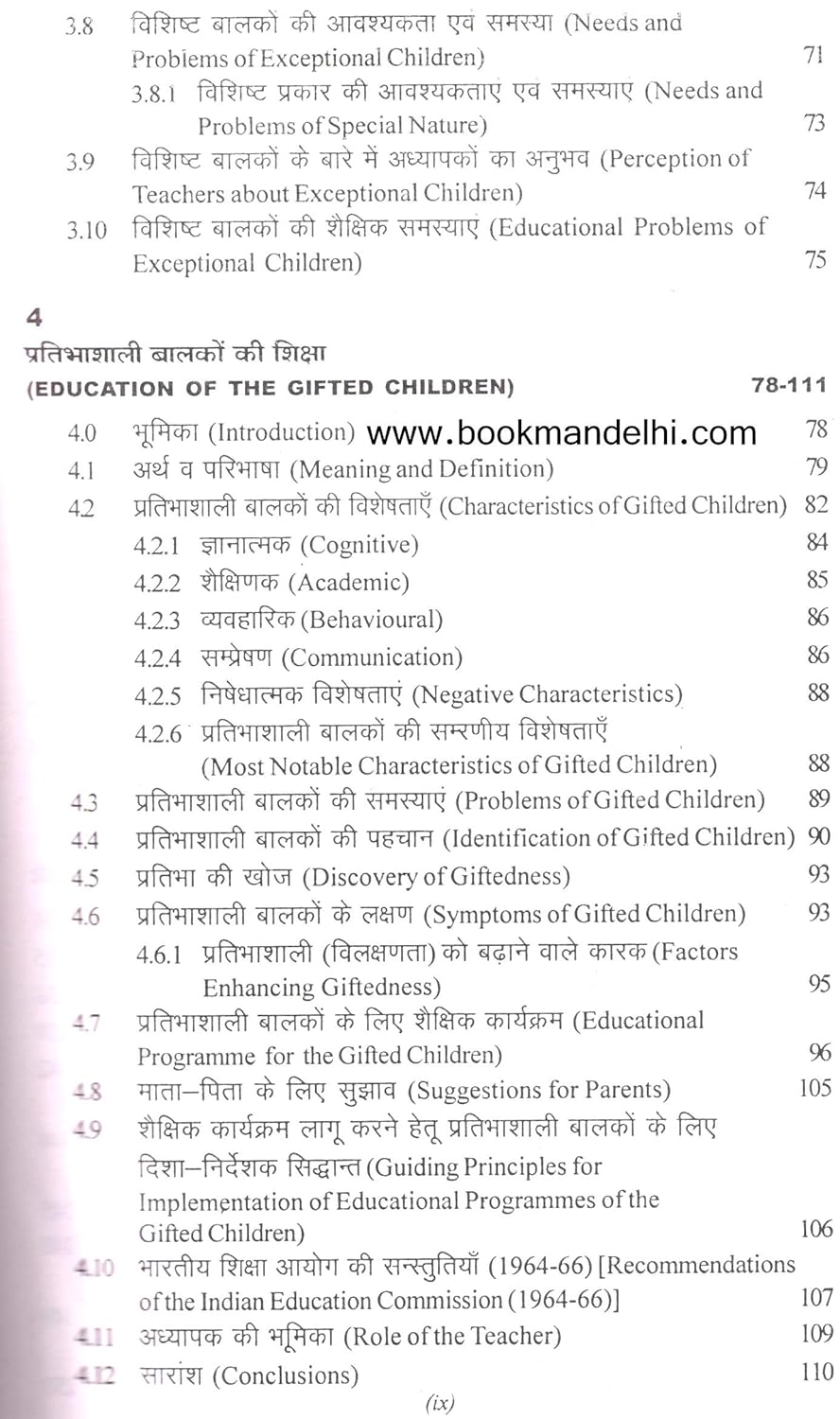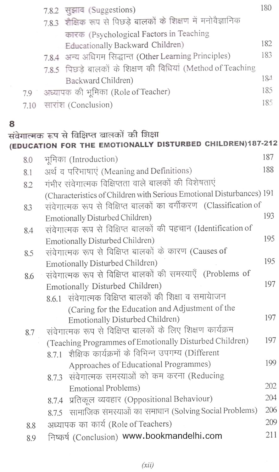 1. विशेष शिक्षा की अवधारणा और अर्थ 2. विशेष शिक्षा का ऐतिहासिक परिप्रेक्ष्य 3. असाधारण बच्चों की ज़रूरतें और समस्याएँ 4. प्रतिभाशाली बच्चों की शिक्षा 5. रचनात्मक बच्चों की शिक्षा 6. सीखने की अक्षमता वाले बच्चे 7. शैक्षिक रूप से पिछड़े बच्चों की शिक्षा 8. भावनात्मक रूप से परेशान बच्चों की शिक्षा 9. अपराधी बच्चों की शिक्षा 10. मानसिक मंदता वाले छात्रों को पढ़ाना 11. वर्तनी विकलांग बच्चों की शिक्षा 12. दृष्टि बाधित बच्चों की शिक्षा 13. श्रवण बाधित बच्चों की शिक्षा 14. वाणी विकलांग बच्चों की शिक्षा। असाधारण बच्चों की शिक्षा में हालिया रुझान 16. असाधारण बच्चों के लिए मार्गदर्शन और परामर्श 15