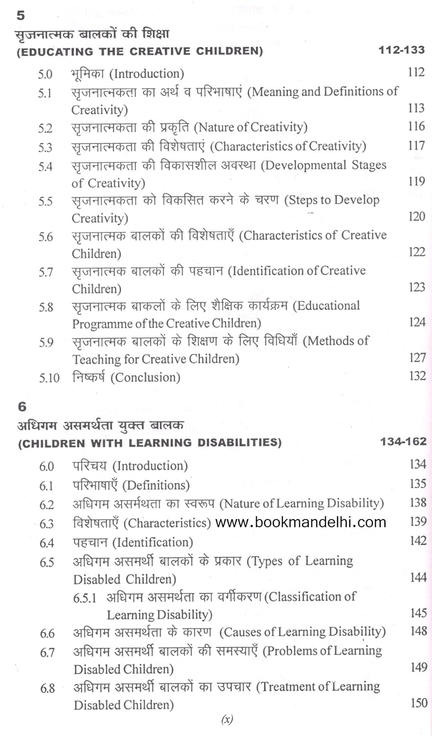 1.Special Education Concept And Meaning 2. Historical Perspective Of Special Education 3.Exceptional Children needs And Problems 4.Education Of The Gifted Children 5.Educating The Creative Children 6. Children With Learning Disabilities 7.Education Of The Educationally Backward Children 8.Education For The Emotionally Disturbed Children 9.Education Of The Delinquent Child 10.Teaching Students With Mental Retardation 11.Education Of Orthographically handicapped Children 12.Education For The Visually Impaired Children 13. Education Of The Hearing Impaired Children 14.Education Of The Speech Handicapped Children.Recent Trends In Education Of Exceptional Children 16.Guidance And Counseling For Exceptional Children 15