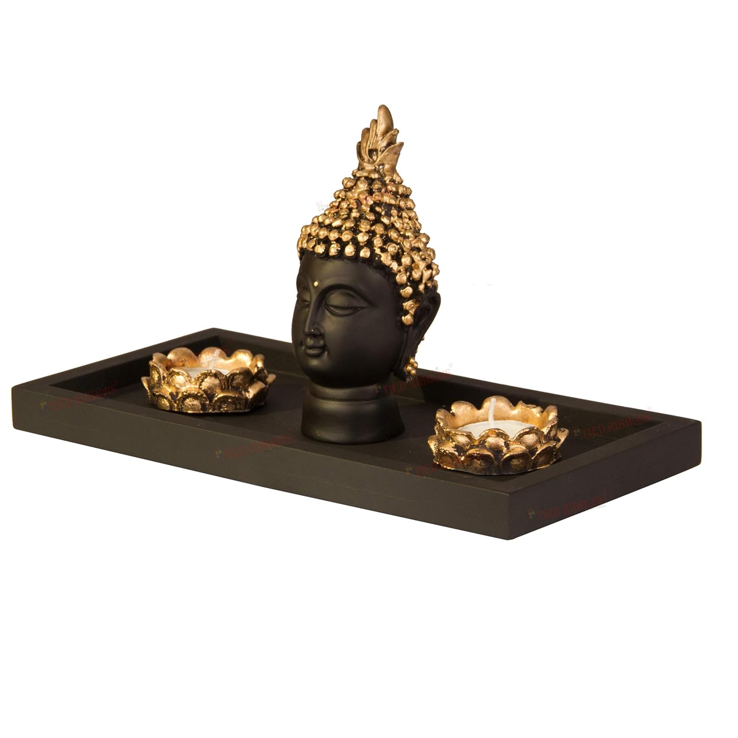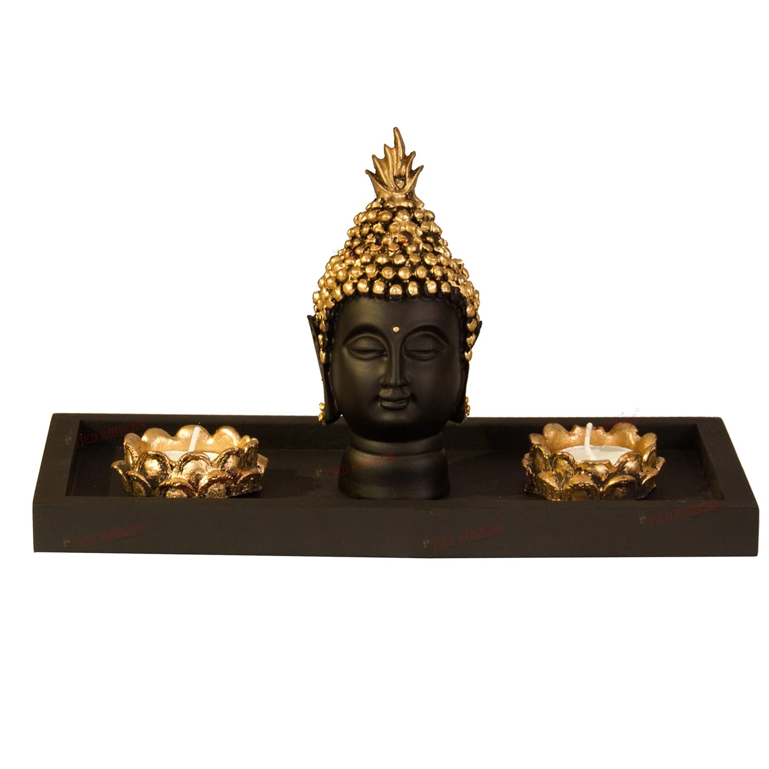 Includes: Buddha head, wooden tray, 2 lotus tealight candle holders