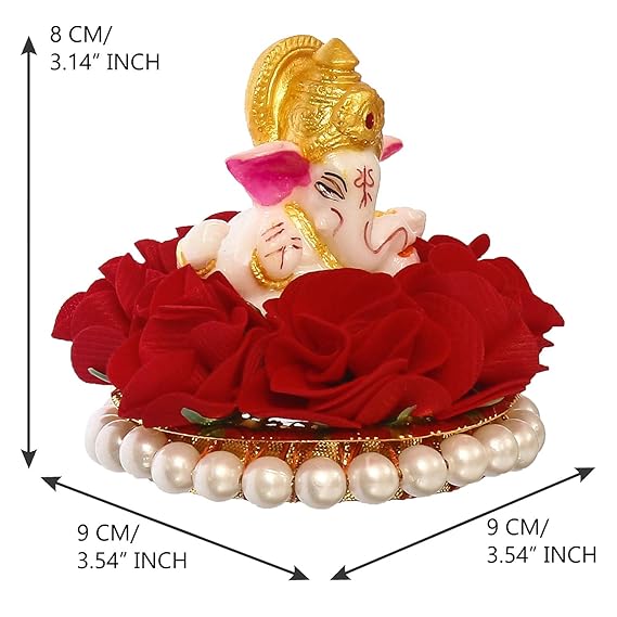 Invite the blessings of Lord Ganesha into your life with this captivating idol. Gracefully adorned on a vibrant red floral plate, this exquisite polyresin statue beautifully blends artistry and spirituality.