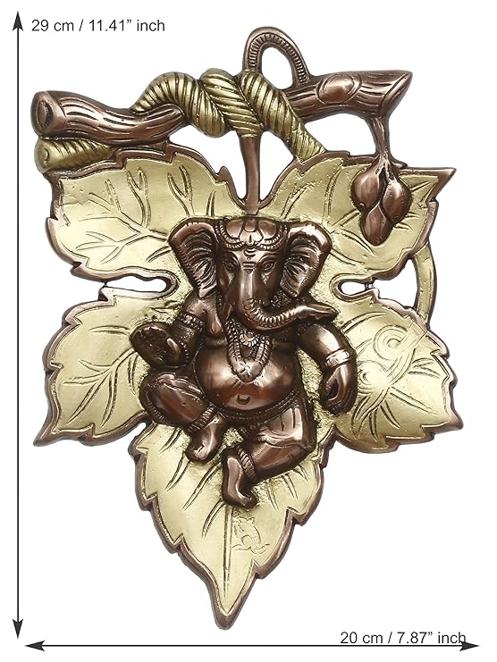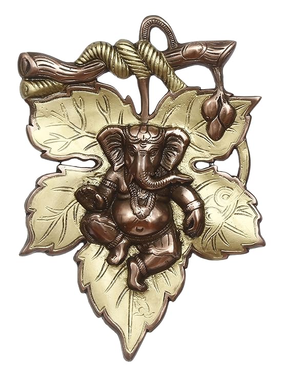 Hindu Gods : Ganesha Golden and Copper Finish Lord Ganesha On Leaf Metal Wall Hanging for Home, Living Room, Office Decor & Gift