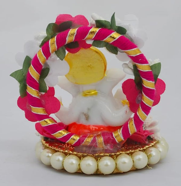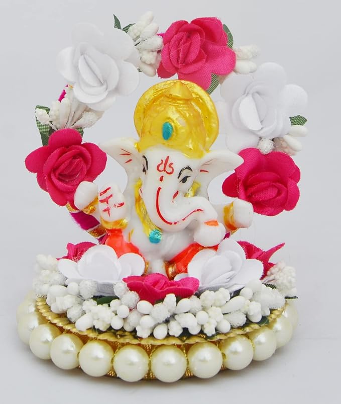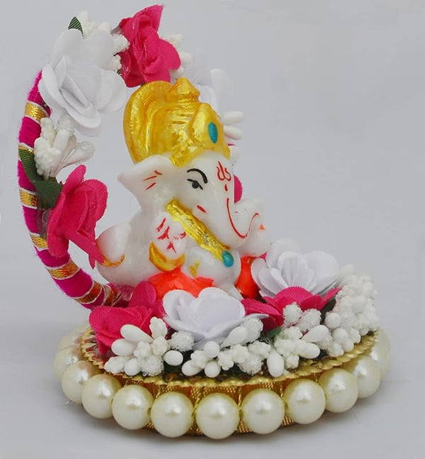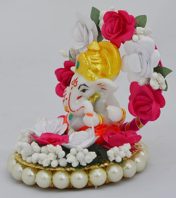 Hindu Gods : Ganesha Lord Ganesha Idol on Decorative Plate with Throne of Pink and Yellow Flowers for Home Decor, Car Dashboard and Gifts