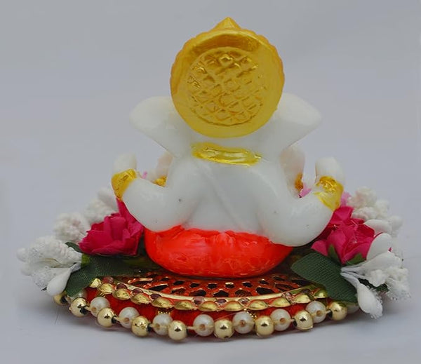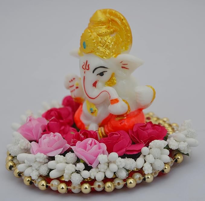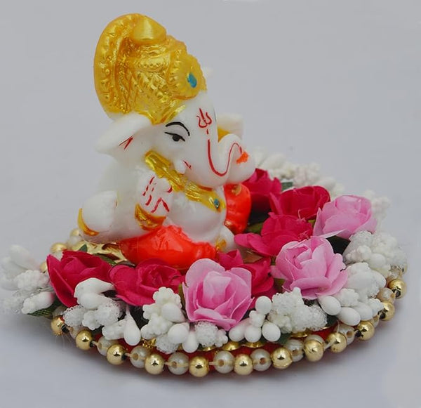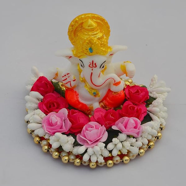 Hindu Gods : Ganesha Lord Ganesha Idol on Decorative Plate with Throne of Pink and Yellow Flowers for Home Decor, Car Dashboard and Gift