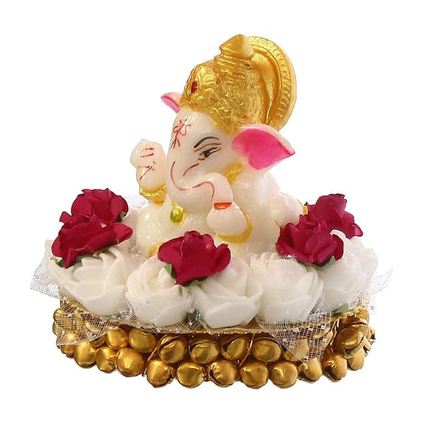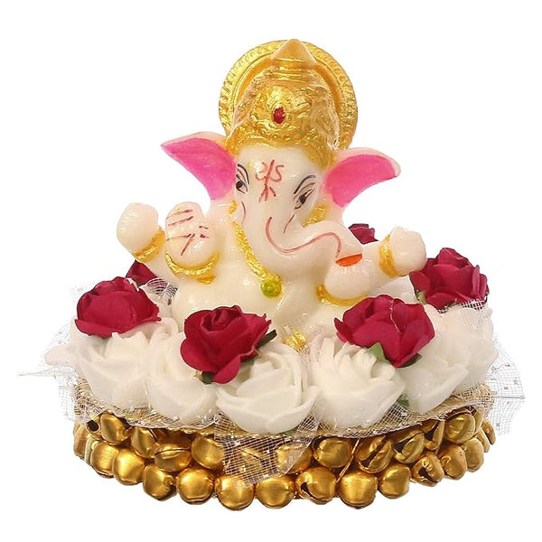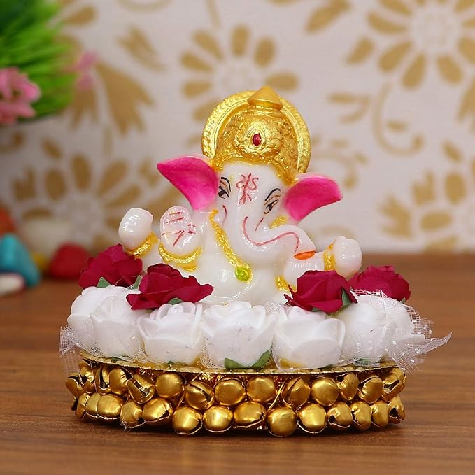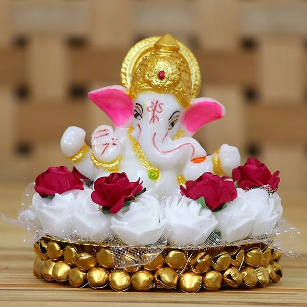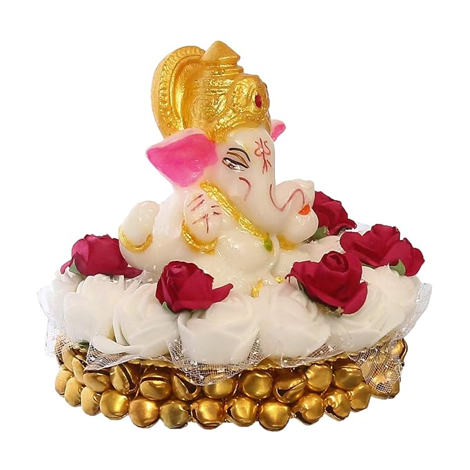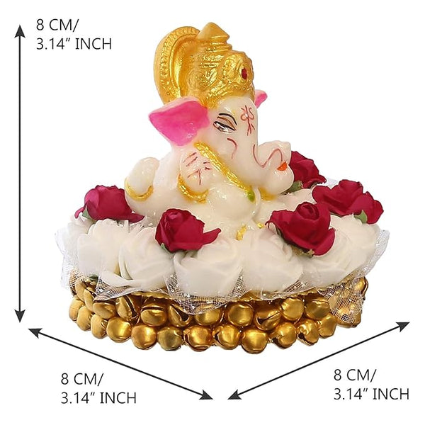 Hindu Gods : Ganesha Lord Ganesha Idol on Decorative Plate with White Flowers for Home Decor, Car Dashboard and Gifts