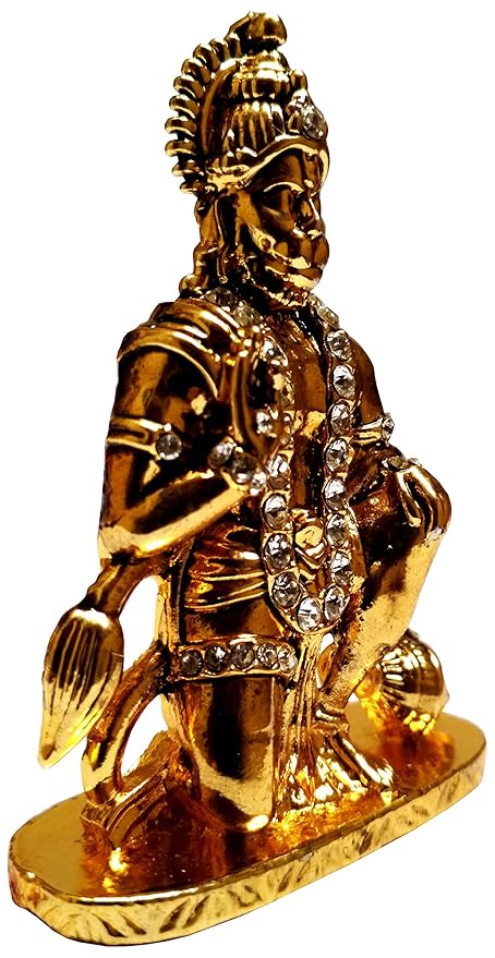 Enhance your space with the radiant energy of Lord Hanuman Ji. This handmade metal idol, featuring a stunning golden finish and adorned with sparkling stones, is a testament to exquisite craftsmanship, honoring Hindu deities and the rich traditions of Hinduism.