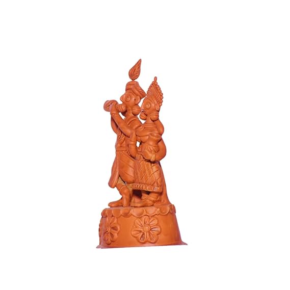 This exquisite 9.5-inch terracotta Radha Krishna idol, handcrafted with meticulous detail, is a stunning addition to any home or office. The vibrant red and brown colors create a captivating aura, while the intricate design of Radha and Krishna playing the flute symbolizes eternal love, devotion, harmony, and happiness.