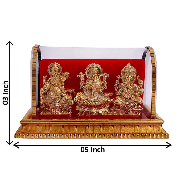 Elevate your home or office with the enchanting aura of this exquisite metal statue featuring the revered Hindu trinity - Lord Ganesh, Goddess Lakshmi, and Goddess Saraswati. This compact and captivating set (approximately 12 cm tall) represents the complete package for a successful and fulfilling life.