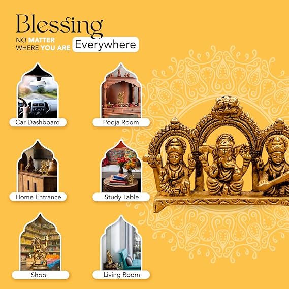 Bring the combined blessings of wealth, wisdom, and prosperity into your home with this exquisite pure brass idol. Featuring Laxmi, Ganesh, and Saraswati, this statue embodies the essence of divine grace and abundance.