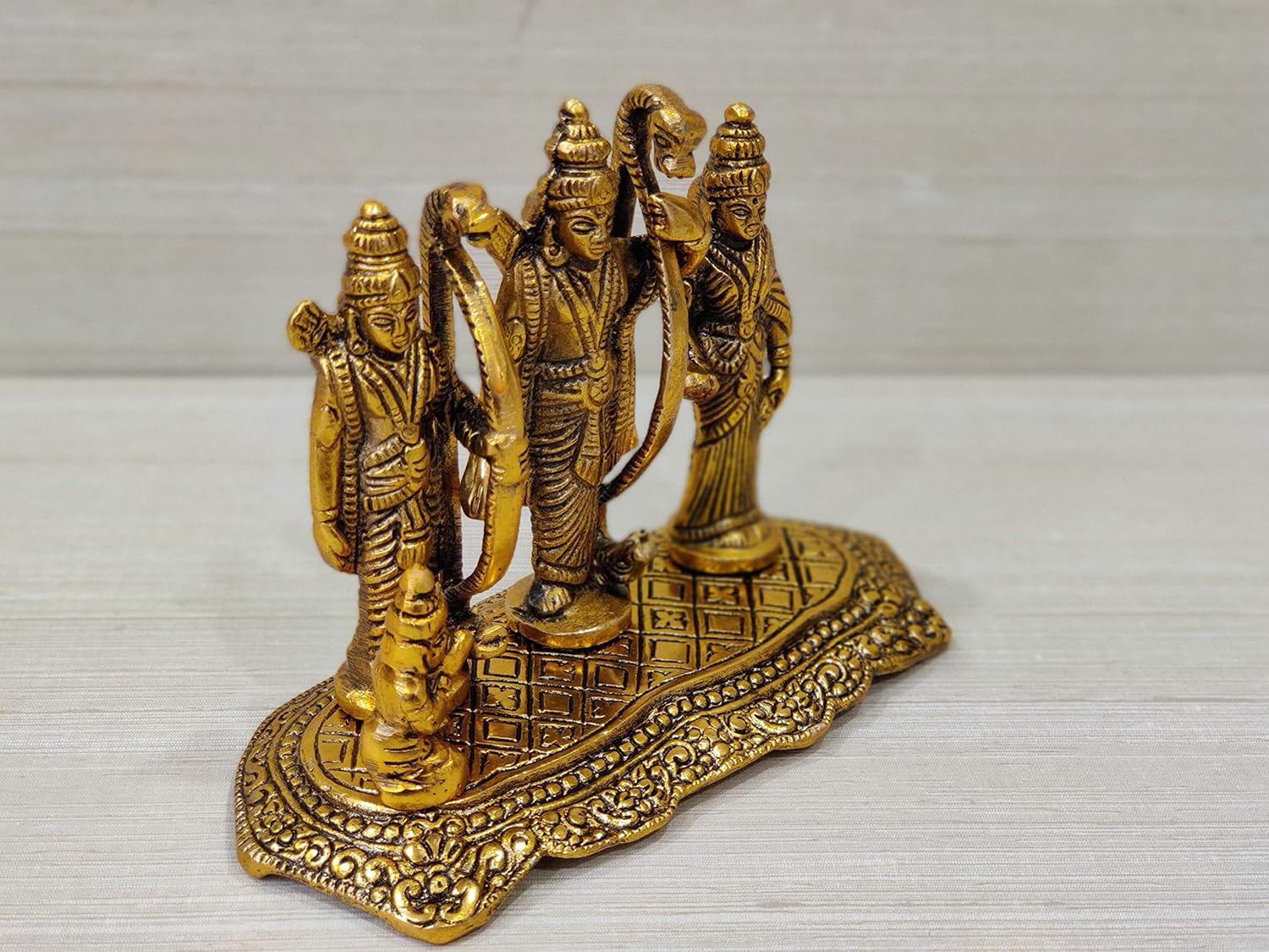 Experience the divine grace of Lord Rama, Sita, Laxman, and Hanuman with this exquisite metal showpiece. Meticulously crafted with a golden oxidized finish, this intricate artwork captures the essence of the sacred Ram Darbar.