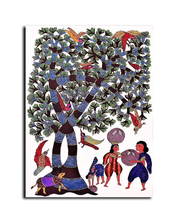 Canvas Print Gond Art , Busy Day, Traditional Art Painting, Classic Art, Indian Art, for Living Room, Wall Decoration, Unframed Painting, Fabric |Size- 12X9 inches.