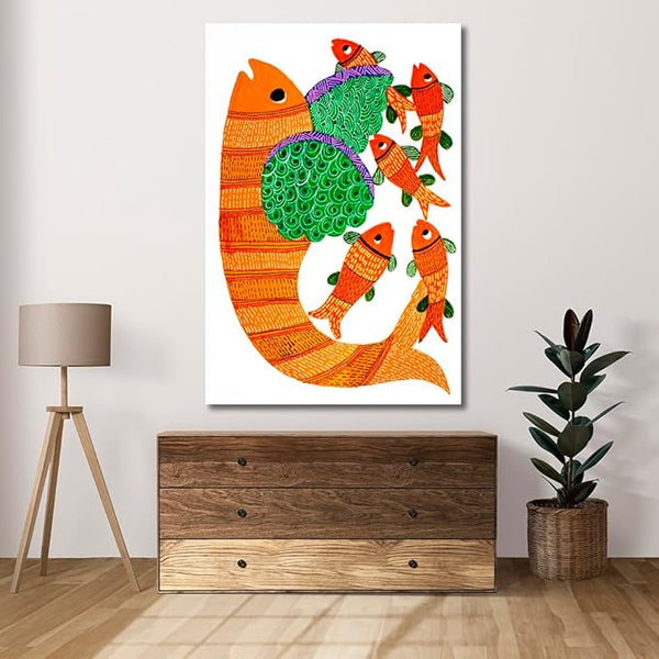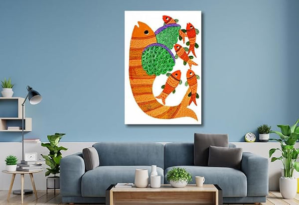 Canvas Print Gond Art , Flying Fish, Traditional, Classic Art, Indian Art,for Living Room, Wall Decoration, Unframed Painting, Fabric |Size- 12X9 inches.
