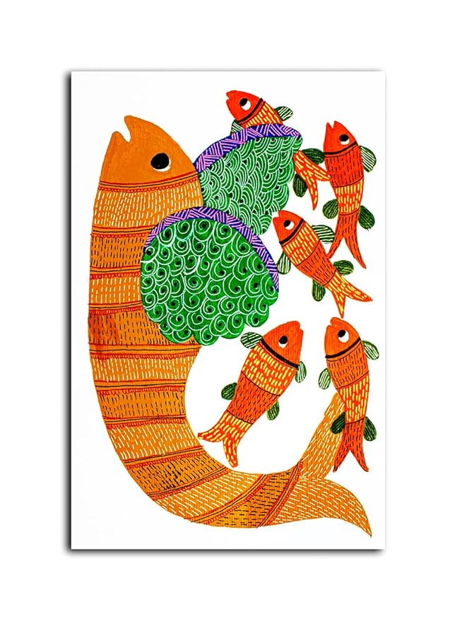 Discover the vibrant world of Gond art with our unframed canvas paintings featuring flying fish. These traditional Indian artworks, renowned for their intricate designs and bold colors, offer a unique and inspiring addition to your home decor.