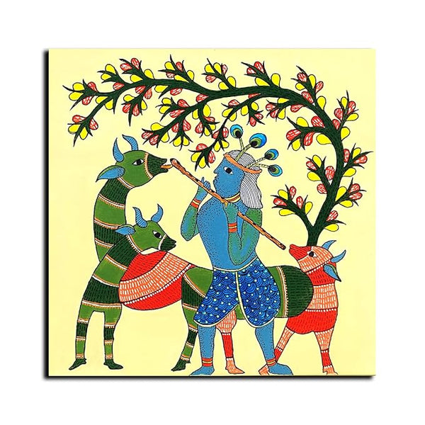 Canvas Print Gond Art , Shri Krishna, Traditional, Religious Art, Indian Art,for Living Room, Wall Decoration, Unframed Painting, Fabric |Size-12X12 inches.