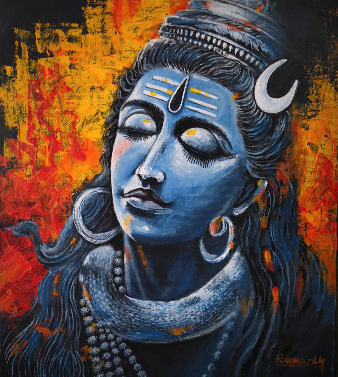 With bold brushstrokes and vibrant acrylic colors, the artist skillfully depicts Shiva's majestic form, adorned with iconic symbols—the Third Eye, Crescent Moon, and Snake. Each element resonates with profound meaning, inspiring introspection and spiritual exploration, reflecting the rich traditions of Hindu deities and the essence of the Hindu faith.