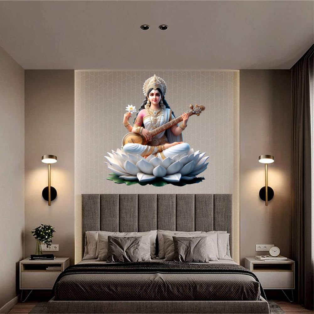 Maa Saraswati God Wall Sticker for Pooja Room, Livingroom, Bedroom, Office, Kidsroom (Size - 45 CM x 45 CM) (Desg_0105)