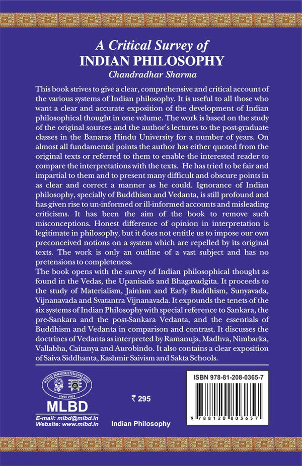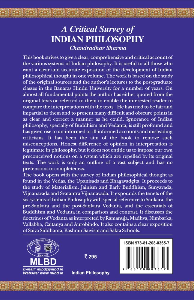 Aim in this work has been to give a clear, comprehensive and critical account of the various systems of Indian philosophy. The book will be found useful by all those who want a clear and accurate exposition of the development of Indian philosophical thought in one volume which is neither too small nor too big. On almost all fundamental points the author has either quoted from the original texts or referred to them to enable the interested reader to compare the interpretations with the texts. Throughout the exposition of the different systems which involves criticism and evaluation, the author has tried to be fair and impartial to them and to present many difficult and obscure points in as clear and correct a manner. Ignorance of Indian philosophy, specially of Buddhism and Vedanta, is still profound and has given rise to un-informed or ill-informed accounts and misleading criticisms. It has been the aim of the book to remove such misconceptions. Honest difference of opinion in interpretation is legitimate in philosophy, but it does not entitle us to impose our own preconceived notions on a system which are repelled by its original texts. The work is only an outline of a vast subject and has no pretensions to completeness. The present treatise is a critical study of different systems of Indian Philosophy based on original sources and its principal value lies in their interpretation. On almost all fundamental points the author has quoted from the original texts to enable the reader to compare the interpretations with the text. The book opens with the survey of Indian philosophical thought as found in the Vedas, the Upanisads and Bhagavadgita. It proceeds to the study of Materialism, Jainism and Early Buddhism, Sunyavada, Vijnanavada and Svatantra Vijnanavada