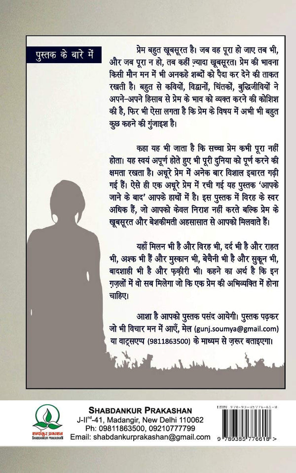 Love is very beautiful. Even when it is complete, but it is even more beautiful when it is not complete. It is also said that true love is never complete. It has the ability to complete the whole world even though it is incomplete itself. Many times great verses have been written in incomplete love. This book written in such an incomplete love, 'Aapke Jane Ke Baad' is in your hands. There are more tones of separation in this book. Which not only disappoints you but also introduces you to the beautiful and priceless feelings of love. Here there is union and separation, pain and relief, tears and smiles, restlessness and comfort, kingship and poverty. What I mean to say is that in these ghazals you will find everything that should be there in the expression of love.