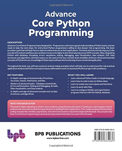 With its clear explanations, practical exercises, and comprehensive coverage of advanced topics, "Advanced Core Python Programming" empowers you to tackle any Python project with confidence. Whether you're a seasoned programmer or an aspiring developer looking to upskill, this book is your ticket to mastering advanced Python programming.